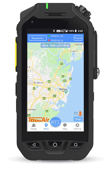 Large dedicated tactile side PTT button, SOS duress alert button and Channel Select knob, operable even when screen locked. Integrated ToooAir app facilitates One to Many and One to One communication and Group monitoring